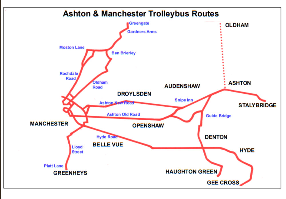 By 1938 Manchester had an extensive tram network. However by the mid 1930s the network was beginning to be phased out in favour of Diesel buses. Moreover, trolleybuses were used from 1938 to 1966 on previous tram routes. There was a large fleet of 189 trolleybuses and nine routes. Bob Rowe States: